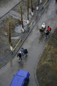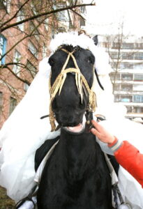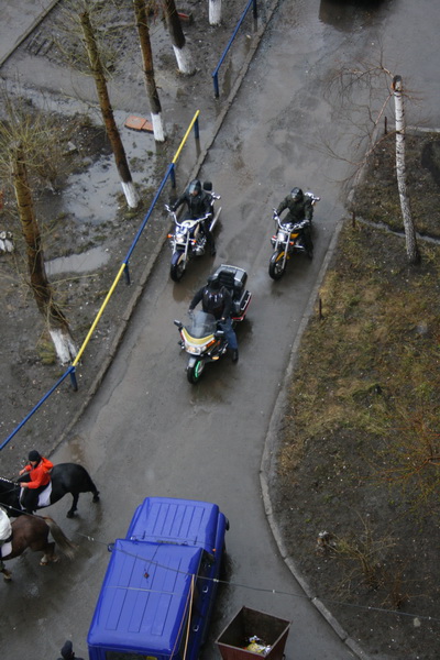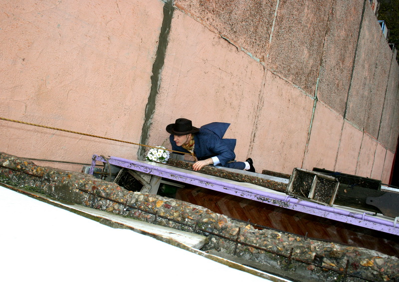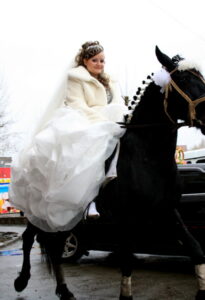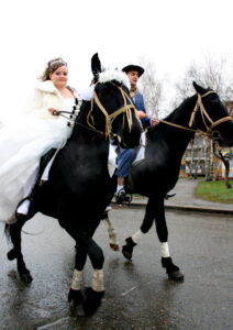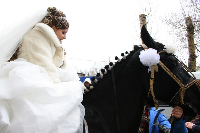 Утром жених прибыл к дому невесты на гнедом скакуне, ведя за собой черную лошадку, на которой будет путешествовать невеста. Чтобы забрать с собой любимую, он поднялся прямо по стене дома на девятый этаж.
