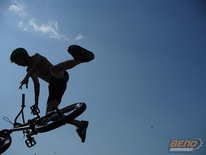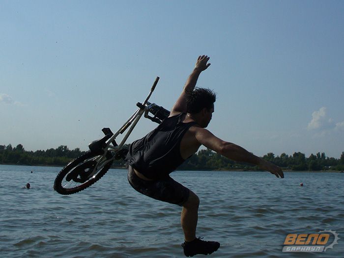 У каждого участника зачета «Длина» было две попытки, а не три как планировалось ранее. Все потому, что ребята приехали немного раньше и уже успели опробовать трамплин, и некоторым прыжки в воду вне зачета уже порядком поднадоели. Когда же начались соревнования, велосипедисты развивали нешуточные скорости на такой, казалось бы, маленькой прямой до трамплина! А летали ребята и выше и дальше, чем тренировались! В итоге лучшим по дальности «летчиком» стал Михаил Степанищев. Он прыгнул на 4,5 «крокодильчика» (плавающие в воде игрушки на расстоянии метр друг от друга). Совсем чуть-чуть недотянул до победителя Роман Семенов. Третий результат был у Кирилла Одинцова.