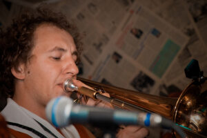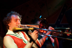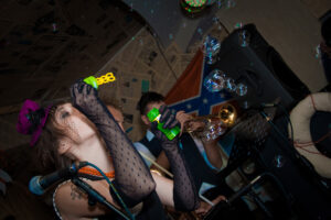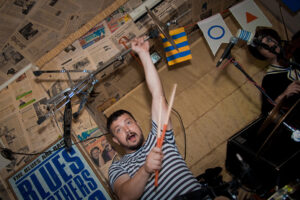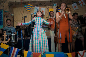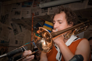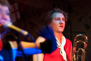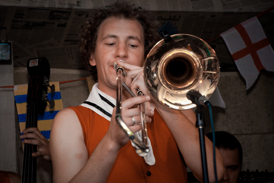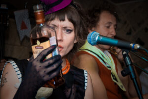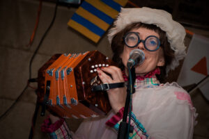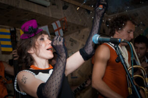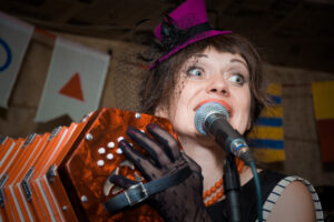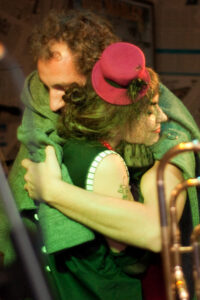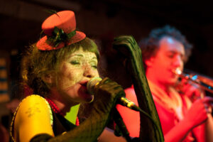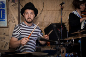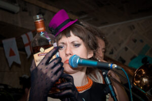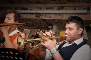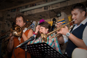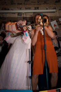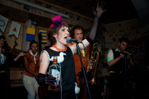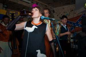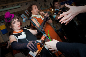 «Серебряная свадьба» – это разбитная компания из гитары, контрабаса, трубы, тромбона, скрипки, концертины, стиральной доски и барабанов под предводительством тубы прямо на глазах у публики готовит необыкновенный коктейль из французского шансона, диксиленда, кантри, русской народной музыки и латиноамериканских ритмов в манере уличного оркестра.
