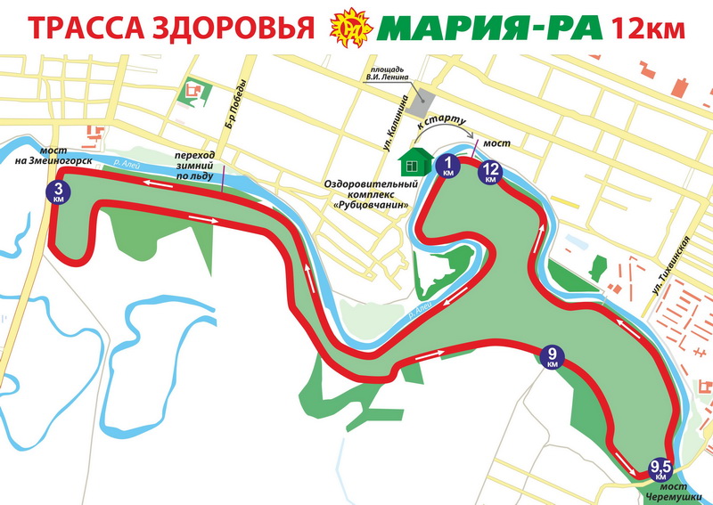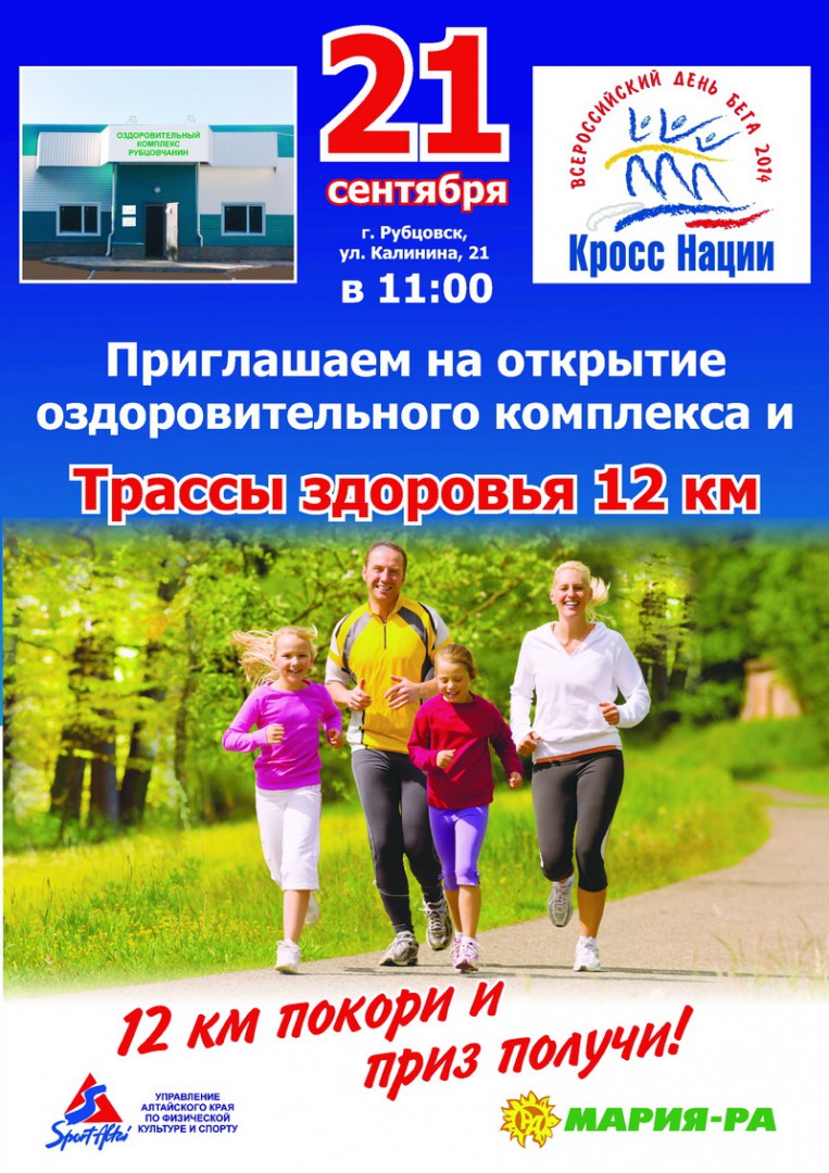 В предстоящее воскресенье, 21 сентября, в крае пройдут мероприятия Всероссийского дня бега «Кросс наций-2014». Любители здорового образа жизни присоединятся к всероссийской акции в Барнауле, Бийске, Заринске, Славгороде, Яровом, Бурле, Тогуле. А главный краевой старт состоится в Рубцовске. В этот день, 21 сентября, в 11.00 здесь состоится открытие уникального оздоровительного комплекса и 12-километровой трассы здоровья «Мария-Ра», передает пресс-служба управления Алтайского края по физической культуре и спорту. Организаторы праздника: управление Алтайского края по физической культуре и спорту, администрация города и компания «Мария-Ра».
