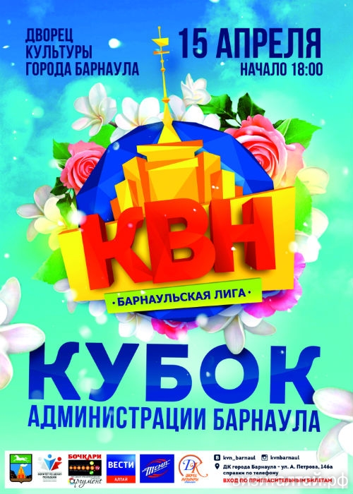 15 апреля – игра Барнаульской лиги КВН – Кубок Администрации Барнаула. На сцену выйдут более 12 команд из Барнаула, Бердска, Бийска, Рубцовска и Кемерово. «Зрителей порадуют своим юмором как новички сцены – школьная, но талантливая команда из Гоньбы «Дневник на стол», так и «старички», во главе с Чемпионом Барнаульской лиги КВН командой «Город грез». Но самый большой подарок жителям города сделала Администрация г.Барнаула: любой желающий может посетить Кубок совершенно бесплатно! Достаточно просто прийти 15 апреля в ДК г. Барнаула и при входе в зал получить пригласительный билет. Количество мест ограничено лишь вместимостью зала, поэтому совет желающим попасть на Кубок наверняка: спрашивайте бесплатные пригласительные билеты заранее у распространителей», – сообщили организаторы.