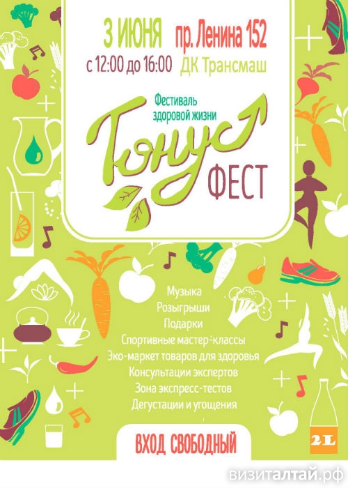 Праздник здоровья, семьи и счастливой жизни – так рассказывают о фестивале «Тонус» его организаторы: «Гости также смогут пообщаться со специалистами в сфере здоровья, попробовать и приобрести здоровые, экологичные и вкусные продукты, новинки алтайских производителей».