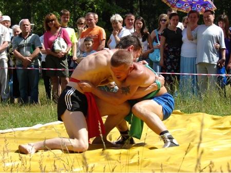 На майдане соревнуются в подъёме тяжестей – пудовой и двухпудовой гири, широко распространены шуточные соревнования. Это различные состязания в беге: бег с ложкой и яйцом во рту, бег с вёдрами в коромысле, наполненными водой, бег в мешках, бег по двое, когда левая нога одного привязана к правой ноге другого. Также проходят бои мешками, набитыми сеном или травой, при этом соперники сидят на скользком бревне. Ещё состязаются в игре, во время которой нужно с завязанными глазами разбить палкой глиняный горшок, стоящий на земле. Пользуются популярностью перетягивание каната, палки, лазанье на высокий гладкий столб с призом наверху.