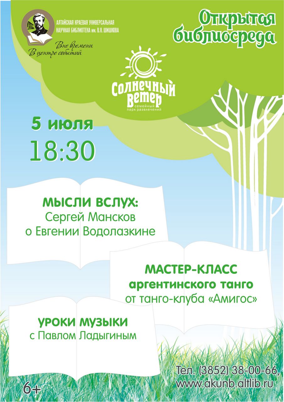 Сегодня «Открытая библиосреда» будет посвящена одному из самых читаемых прозаиков современности – Евгению Водолазкину. Встречаемся в парке с Сергеем Мансковым и его «мыслями вслух», потом танцуем танго и играем на гитаре!