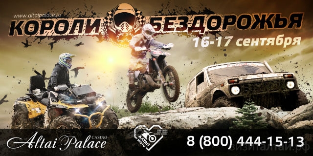 C 15 по 17 сентября в игорной зоне «Сибирская Монета» состоится Первый ежегодный фестиваль технических видов спорта – «Короли Бездорожья 2017». Фестиваль соберет более 200 спортсменов со всей России. В 3-х дневной программе фестиваля: эндуро на мотоциклах, гонка на квадроциклах, гонки на джипах.