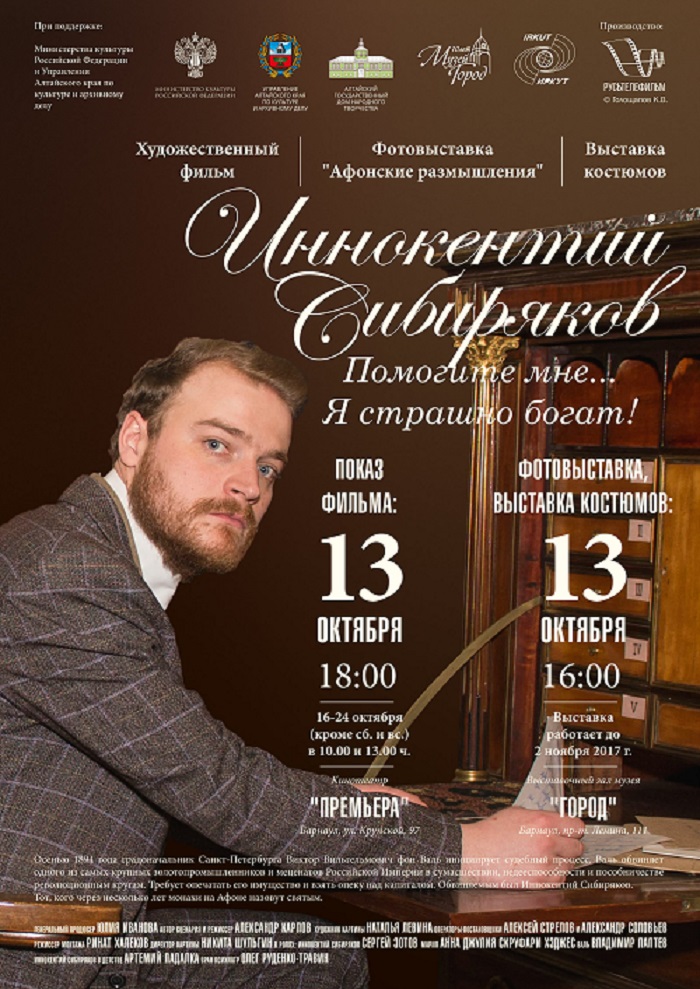13 октября в 18.00 часов в кинотеатре «Премьера» пройдет презентация фильма «Иннокентий Сибиряков. Помогите мне… я страшно богат!» (6+) и творческая встреча с создателями фильма.