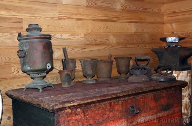 В музее насчитывается около 25 предметов: кованые изделия, украшения из меди, самовары, чугунные утюги, керосиновые лампы, молоты, наковальни. Самые ценные – немецкий сундук и прялка.