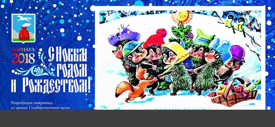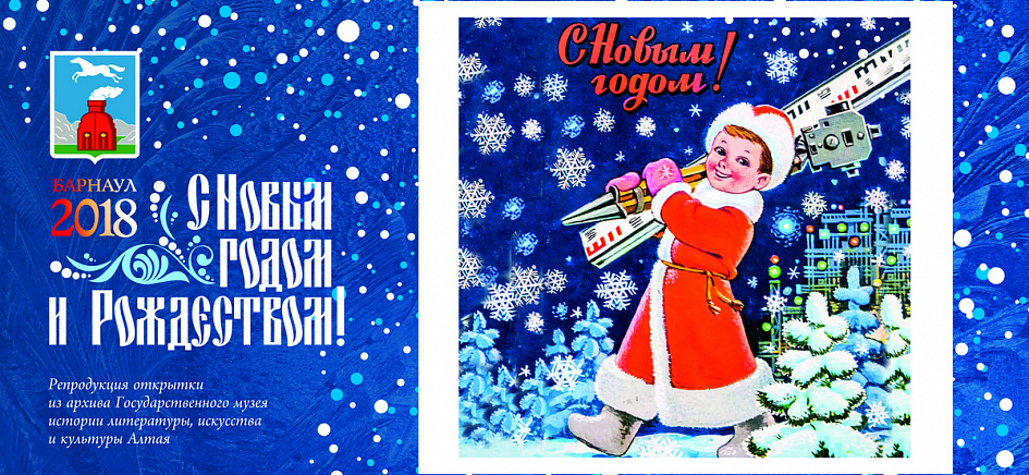 Комитетом по строительству, архитектуре и развитию города разработаны эскизы праздничных баннеров, в которых использовались мотивы новогодних и рождественские открыток. Сюжетная часть эскиза сформирована из репродукций открыток, которые находятся в архиве Государственного музея истории литературы, искусства и культуры Алтая.