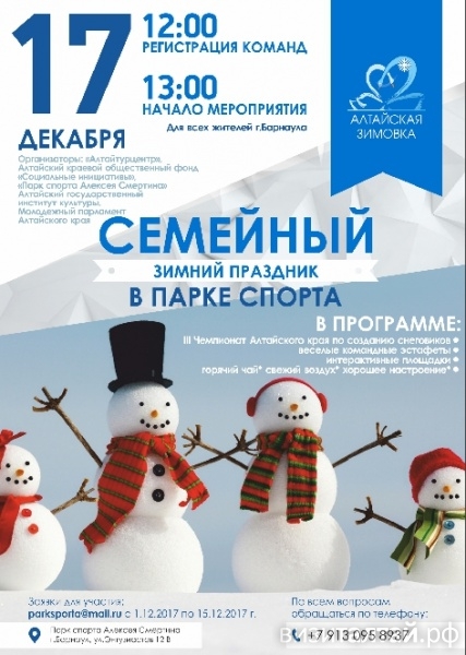 В декабре в Алтайском крае пройдет праздник «Алтайская зимовка», посвященный прилету лебедей и открытию зимнего туристического сезона 2017 года. В программе – более 50 интересных зимних мероприятий. Одним из ярких событий праздника «Алтайская зимовка» – станет Чемпионат Алтайского края по созданию Снеговиков. Он состоится 17 декабря 2017г. в Парке Спорта Алексея Смертина (г. Барнаул, ул. Энтузиастов 12, в).