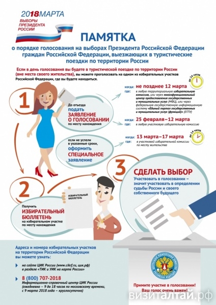 Федеральное агентство по туризму подготовило информацию о возможностях голосования на выборах Президента Российской Федерации в период турпоездки. Памятки разработаны при участии крупнейших турагентских сетей, а также общественных организаций турагентов – «Союза Туристических Агентств» (СТА) и Ассоциации «Альянс туристических агентств» (АТА), а также с учетом рекомендаций ЦИК России.