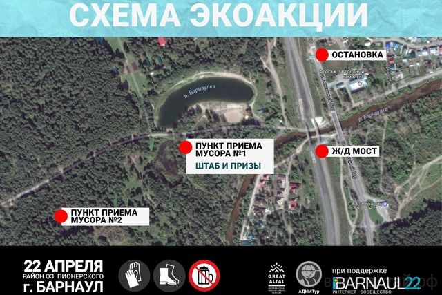 Акция «Чистые реки Алтая» пройдет 22 апреля в пригородной зоне отдыха в районе Борзовой Заимки и озера Дружных (Пионерского). Начало – в 10.00. Проводит акцию Ассоциация детского и молодежного туризма Алтайского края (АДИМТур). Партнеры акции – общественное движение Great Altai, портал Barnaul 22, МБУДО «Память», ИП Сергеев С.В., ИП Степанюк В.В., ООО «Магистр», АКЭОО «Моя малая родина». Организаторы приглашают к партнерству предпринимателей города, неравнодушных к экологическому благополучию окружающей среды.