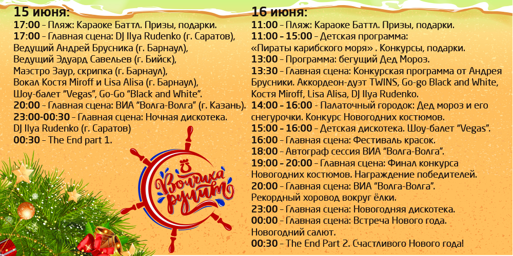 Пляжными караоке-баттлами с призами и подарками будут начинаться оба фестивальных дня. Скрипка, шоу-балет, гоу-гоу группа, ведущие программы из Бийска и Барнаула – семь с половиной часов гости «Алтайфеста» будут отрываться в пятницу и полсуток – в субботу. 16 июня с самого утра начнутся конкурсы для взрослых и детей, главный из них – конкурс новогодних костюмов. Фестиваль красок, рекордный хоровод вокруг елки и ночной новогодний салют войдут в программу второго дня «Алтайфеста» между Гуселетовских озер.