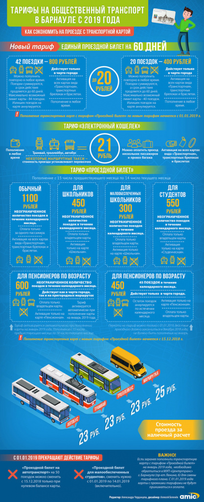 1 января 2019 в Барнауле изменятся тарифы на проезд в общественном транспорте. Поменяется и стоимость транспортных карт, некоторые из тарифов по картам перестанут действовать, появятся новые. Об этом – инфографика ИА «Амител».