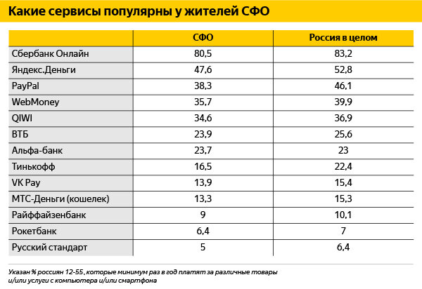 В этом году доли пользователей, которые платили банковскими картами и через интернет-банкинги, в Сибири почти одинаковые – 85,1% и 85,9% соответственно. Из электронных кошельков рассчитывались 73,1% сибиряков. Самый популярный в СФО сервис для оплаты в интернете – Сбербанк Онлайн. С его помощью платили 8 из 10 пользователей из этого региона (80,5%). На втором месте – Яндекс.Деньги, с помощью которых рассчитывался каждый второй (47,6%).